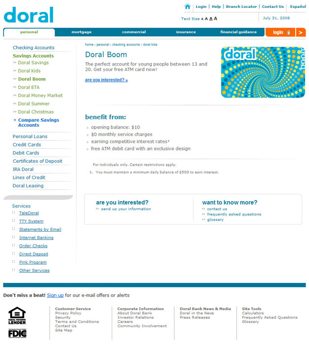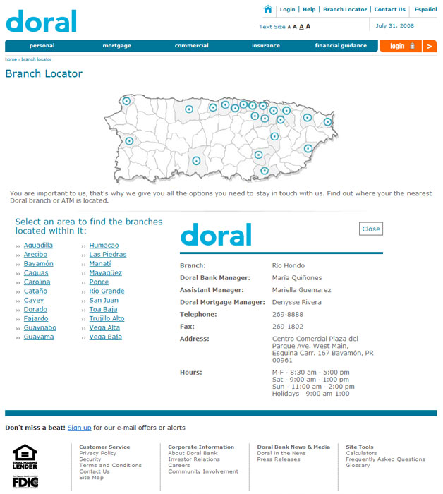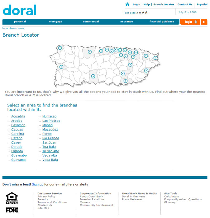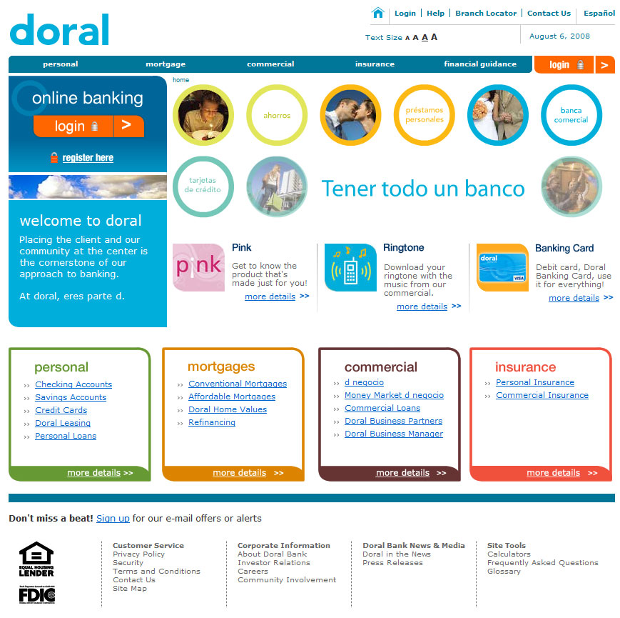 Doral Bank came to me as a complete site redesign that needed to happen by the time they officially launched their company-wide rebranding. In a very short amount of time I managed to take the comps and wireframes and create a clean design that everyone was happy with